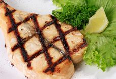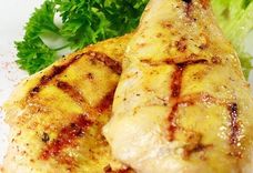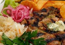 Куриные бедрышки на гриле, жареный картофель, огурец мар., лук мар., капуста кваш., чесночный соус