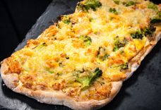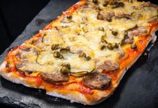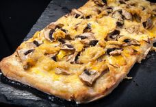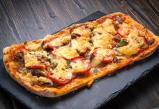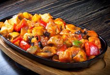 Куриное филе, баклажан, цуккини, перец сладкий, лук, шампиньоны, томатный соус, чеснок, перец халаппеньо