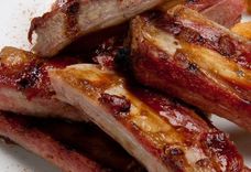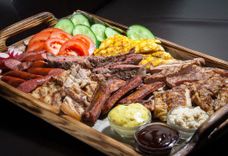 ассорти из разных видов мяса на гриле: вырезка говяжья, бедро цыпленка, филе куриное, филе свинины, ребрышки копченые, грудинка ссвиная, колбаски балтийские, помидоры, огурец, редис, соус датский, соус Барбекю, хрен