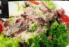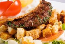 салат, помидоры, сыр Пармезан, соус «Цезарь», гренки, натуральный рубленный бифштекс, яйцо, помидорки черри