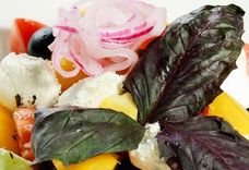 помидоры св., перец св. ,огурцы св., лук маринованный, маслины, сыр Фета, салат, заправка