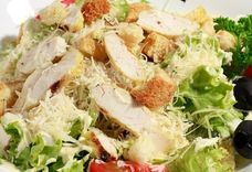 курица, салат, помидорки черри, маслины, сыр пармезан, соус «Цезарь», гренки, зелень