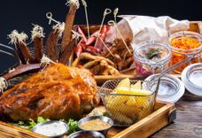 Рулька свиная, ушки свиные фри, крылышки, колбаски к/в гриль, гренки пшеничные, картофель отварной обжаренный, селедочка слабосоленая с лучком, морковь пряная, соусы барбекю, "тар-тар", горчица