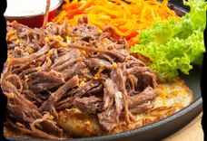 Драники картофельные , говядина томленая рваная, лук фри сметана, морковь пряная