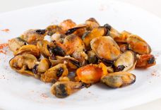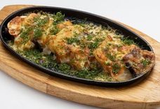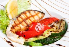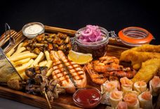 Стейк из семги, филе хека в хрустящей панировке, креветки жареные на гриле, мидии жареные с чесноком, рулетики с семгой сс, закуска из сельди, шампиньоны-гриль, картофель фри, соус тар-тар, кетчуп