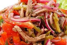язык отварной, перец свежий, огурцы мар., оливки, лук репч., заправка для салата, зелень