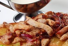 свинина, поджарка,колбаски по-домашнему, соус сметанный, лук, блинчики, редис, зелень