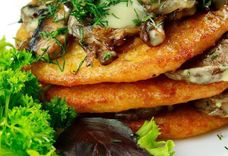 драники с колбаской домашней, жаренными грибами и луком, сметанный соус