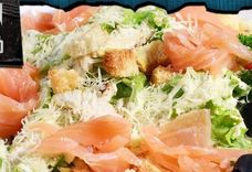 сёмга с/с, салат, помидорки черри, маслины ,сыр пармезан, соус «Цезарь», гренки, зелень